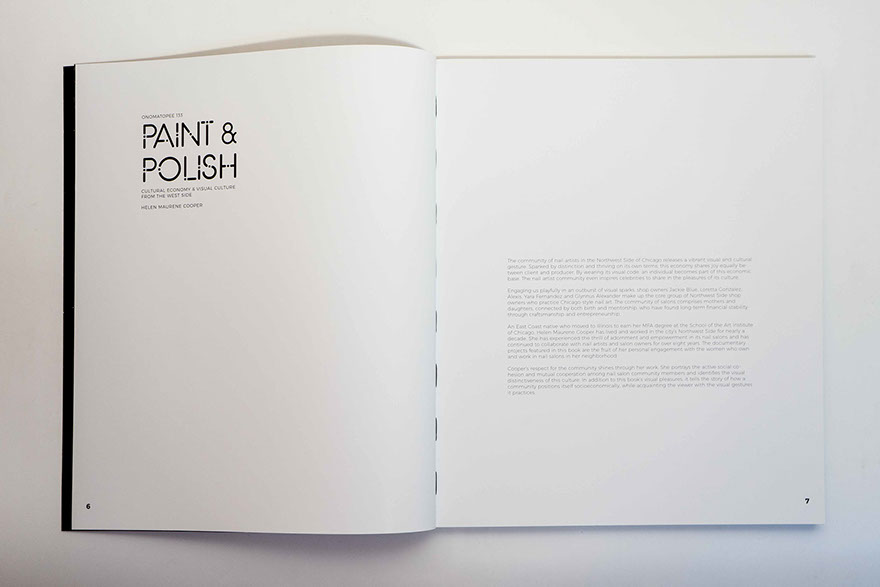 Paint & Polish is a project done by Onomatopee, exhibition space and art book publisher. In collaboration with photographer Maurene Cooper we brought the culture of Nail Art in Chicago together in this publication.